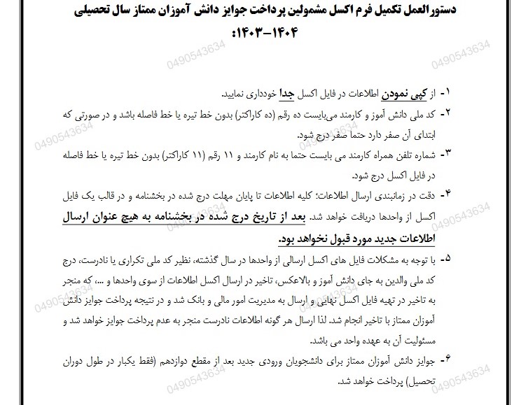 «اسامی فرزندان ممتاز کارکنان رسمی، پیمانی، قراردادی، هیات علمی و شرکتی واحدها حداکثر تا تاریخ 30 شهریور 1404 طبق دستور العمل و فرم اکسل پیوست، تکمیل و به این مدیریت ارسال شود.»