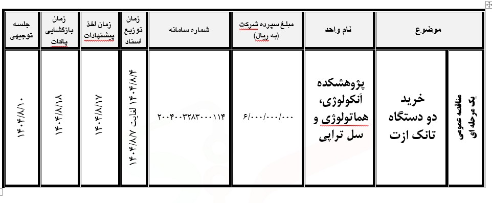 آگهی مناقصه عمومی خرید دو دستگاه تانک ازت برای پژوهشکده آنکولوژی، هماتولوژی و سل تراپی