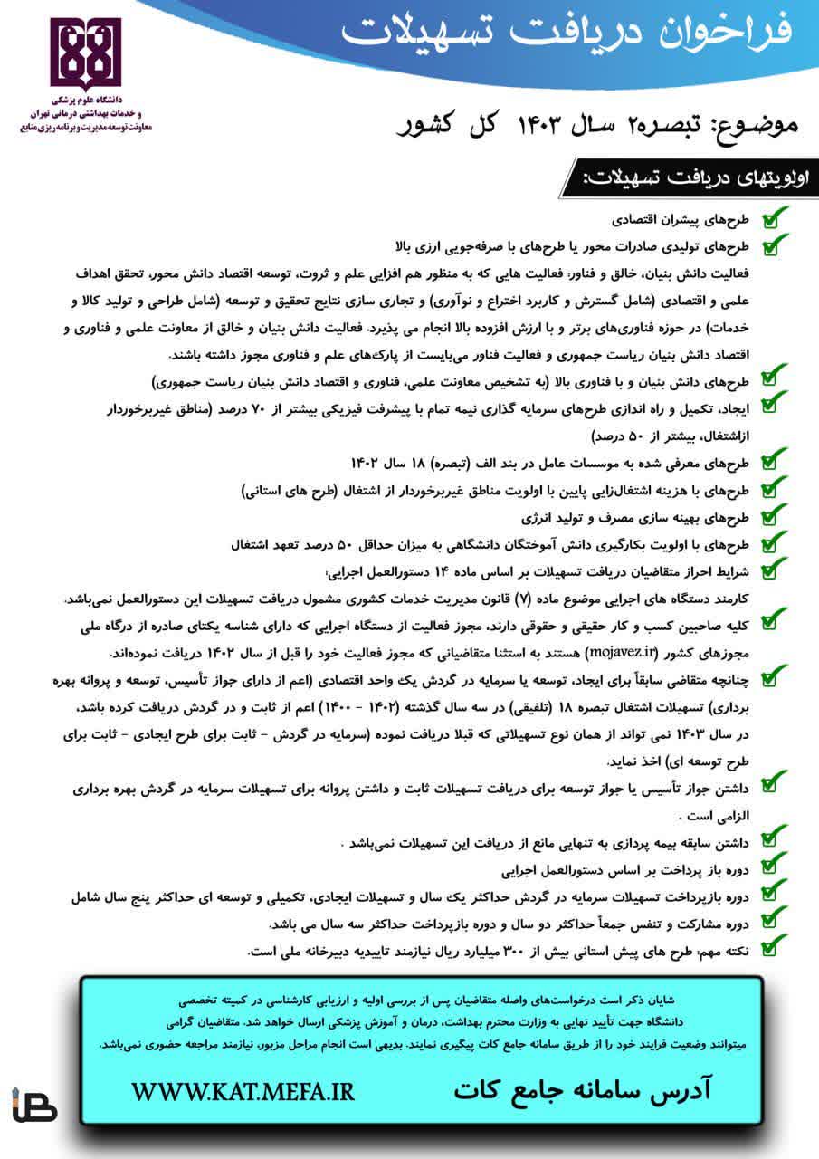•  ﭼﻨﺎﻧﭽﻪ ﻣﺘﻘﺎﺿﻲ ﺳﺎﺑﻘﺎً ﺑﺮﺍﻱ ﺍﻳﺠﺎﺩ، ﺗﻮﺳﻌﻪ ﻳﺎ ﺳﺮﻣﺎﻳﻪ ﺩﺭ ﮔﺮﺩﺵ ﻳﻚ ﻭﺍﺣﺪ ﺍﻗﺘﺼﺎﺩﻱ (ﺍﻋﻢ ﺍﺯ ﺩﺍﺭﺍﻱ ﺟﻮﺍﺯ ﺗﺄﺳﻴﺲ، ﺗﻮﺳﻌﻪ ﻭ ﭘﺮﻭﺍﻧﻪ ﺑﻬﺮﻩ ﺑﺮﺩﺍﺭﻱ) ﺗﺴﻬﻴﻼﺕ ﺍﺷﺘﻐﺎﻝ ﺗﺒﺼﺮﻩ 18 (ﺗﻠﻔﻴﻘﻲ) ﺩﺭ ﺳﻪ ﺳﺎﻝ ﮔﺬﺷﺘﻪ (1400 - 1402) (ﺍﻋﻢ ﺍﺯ ﺛﺎﺑﺖ ﻭ ﺩﺭ ﮔﺮﺩﺵ) ﺩﺭﻳﺎﻓﺖ ﻛﺮﺩﻩ ﺑﺎﺷﺪ، ﺩﺭ ﺳﺎﻝ 1403 ﻧﻤﻲ ﺗﻮﺍﻧﺪ ﺍﺯ ﻫﻤﺎﻥ ﻧﻮﻉ ﺗﺴﻬﻴﻼﺗﻲ ﻛﻪ ﻗﺒﻼ ﺩﺭﻳﺎﻓﺖ ﻧﻤﻮﺩﻩ (ﺳﺮﻣﺎﻳﻪ ﺩﺭ ﮔﺮﺩﺵ - ﺛﺎﺑﺖ ﺑﺮﺍﻱ ﻃﺮﺡ ﺍﻳﺠﺎﺩﻱ - ﺛﺎﺑﺖ ﺑﺮﺍﻱ ﻃﺮﺡ ﺗﻮﺳﻌﻪ ﺍﻱ)، ﺍﺧﺬ ﻧﻤﺎﻳﺪ.