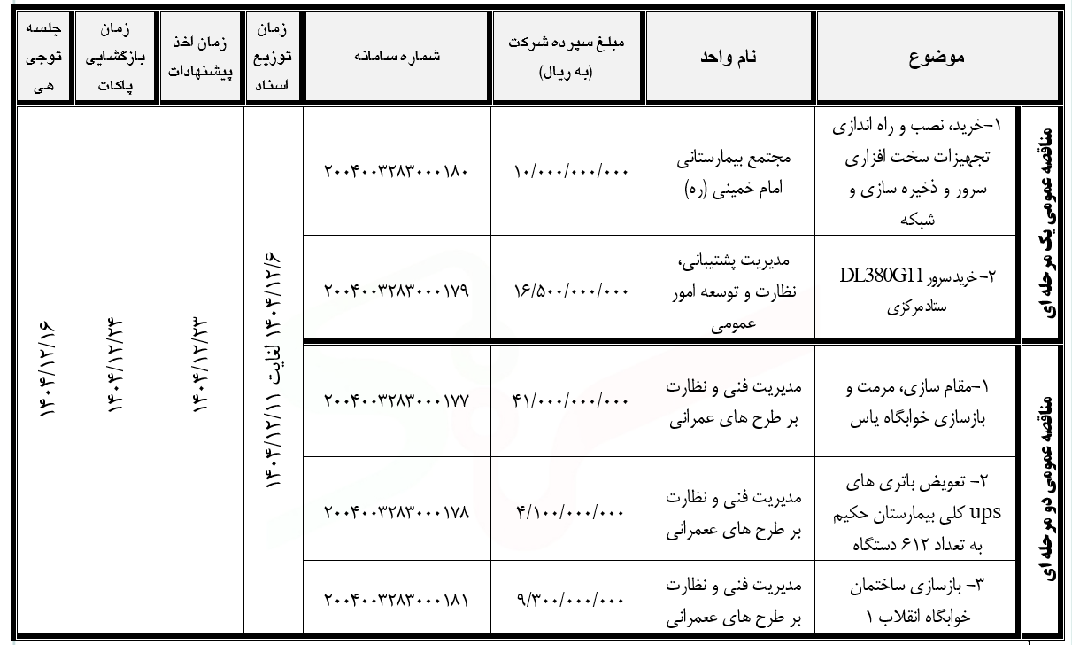 به گزارش روابط عمومی مدیریت پشتیبانی، نظارت و توسعه امور عمومی دانشگاه علوم پزشکی و خدمات بهداشتی درمانی تهران از متقاضیان دعوت می‌نماید درخصوص مناقصات ذیل از طریق درگاه سامانه تدارکات الکترونیکی دولت نسبت به دریافت و تحویل اسناد به آدرس (www.setadiran.ir) اقدام و با توجه به مندرجات اسناد مناقصه مدارک لازم را شامل پاکت (الف) و (ب) و (ج) تهیه و در زمان مقرر در سامانه بارگذاری نمایند. در ضمن یادآور می‌شود کلیه مراحل برگزاری مناقصه از دریافت اسناد تا ارائه پیشنهادات و گشایش پاکات از طریق سامانه مذکور انجام خواهد شد.