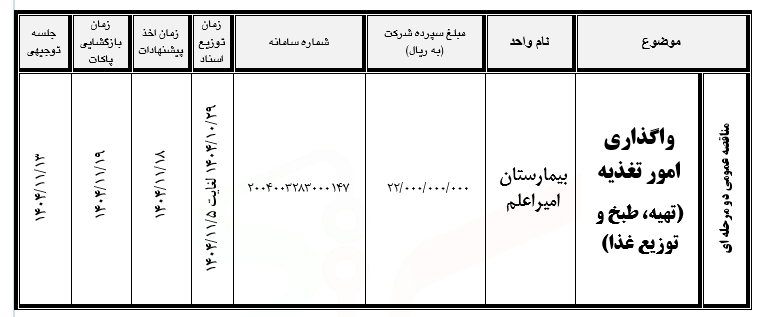 آگهی مناقصه عمومی دو مرحله ای واگذاری امور تغذیه مجتمع بیمارستانی امیراعلم