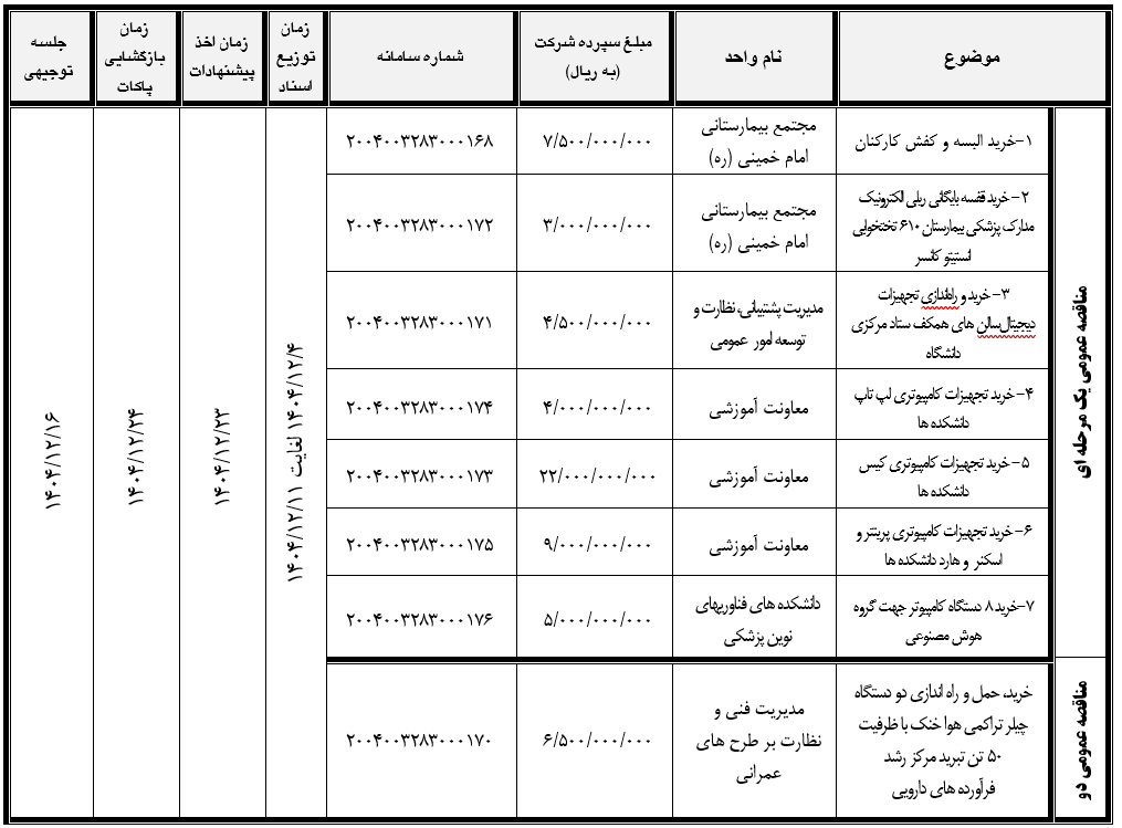 به گزارش روابط عمومی مدیریت پشتیبانی، نظارت و توسعه امور عمومی، دانشگاه علوم پزشکی و خدمات بهداشتی درمانی تهران از متقاضیان دعوت مینماید درخصوص مناقصات ذیل از طریق درگاه سامانه تدارکات الکترونیکی دولت نسبت به دریافت و تحویل اسناد به آدرس (www.setadiran.ir) اقدام و با توجه به مندرجات اسناد مناقصه مدارک لازم را شامل پاکت (الف) و (ب) و (ج) تهیه و در زمان مقرر در سامانه بارگذاری نمایند. در ضمن یادآور میشود کلیه مراحل برگزاری مناقصه از دریافت اسناد تا ارائه پیشنهادات و گشایش پاکات از طریق سامانه مذکور انجام خواهد شد.